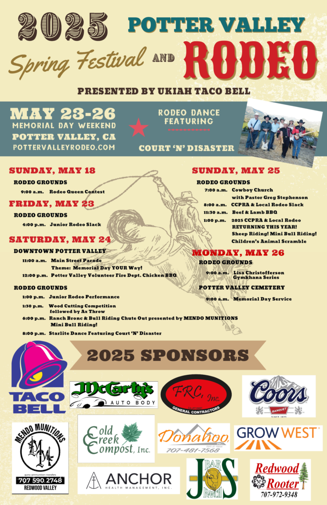 Howdy! Get ready for a fun-filled weekend! We’re thrilled to have you here at Potter Valley Spring Festival and Rodeo. From bull riding to barrel racing, we’ve got some top-notch cowboys and cowgirls showing off their rodeo skills. We also have axe throwing, mutton bustin’ and wood-cutting competitions to entertain the whole family! And with mouthwatering food and toe-tappin’ entertainment, you’re in for a buckin’ good time!